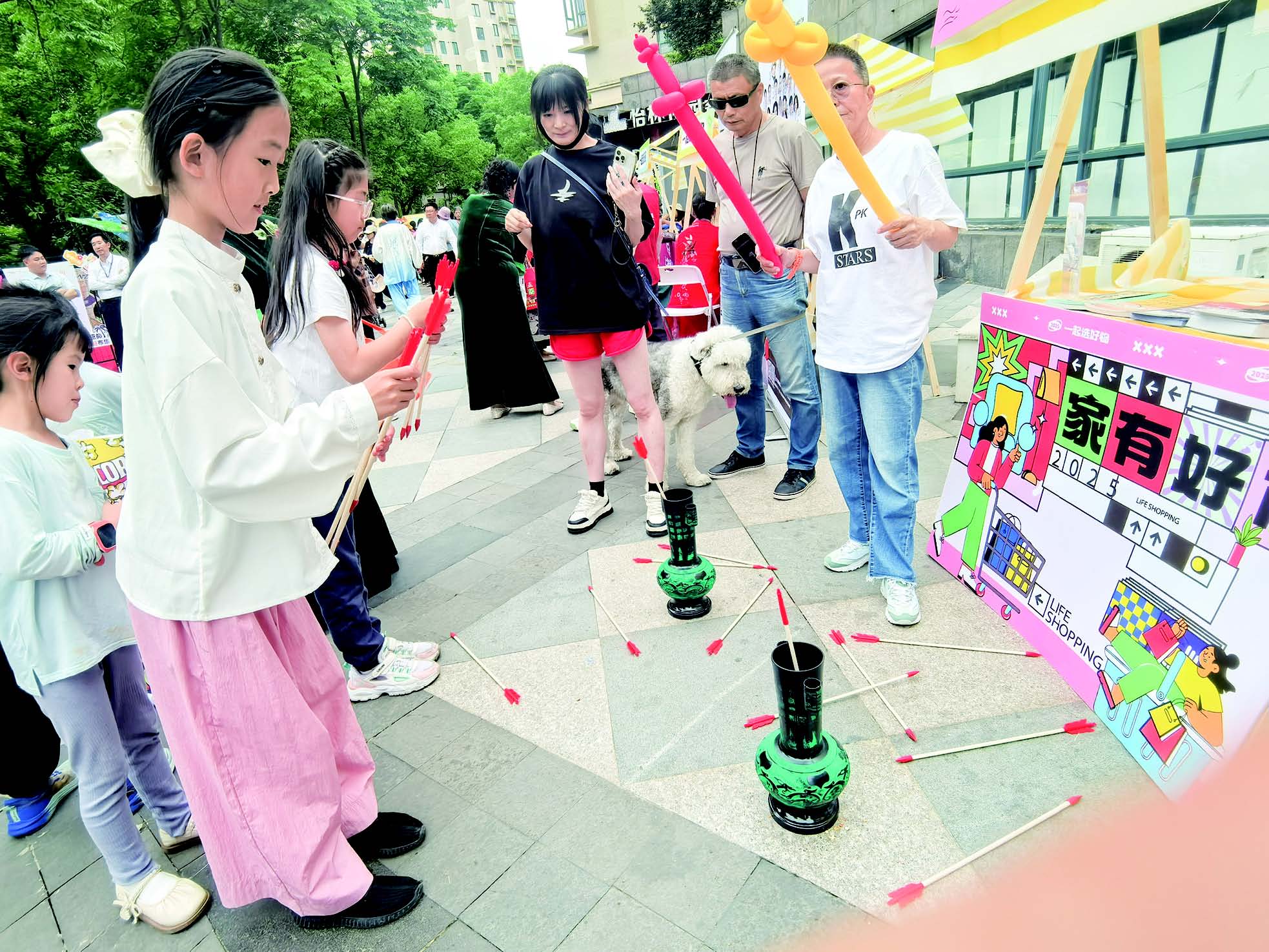 与此同时,公益集市也热闹开张,在社区内“燃”起幸福烟火气。集市设置了口腔检查、推拿、量血压、儿童手工活动、非遗传承漆扇等多个摊位。义诊摊位上,牙医为老人细致“把脉”口腔健康,推拿师通过按揉纾解居民肩颈疲劳。活动区域,有的孩子变身“非遗小匠人”,体验以漆为笔的漆扇画,有的孩子手拿箭枝体验投壶游戏(见左图),感受传统文化的魅力,还有的孩子小心翼翼制作五彩缤纷的马赛克杯垫,现场热闹非凡。