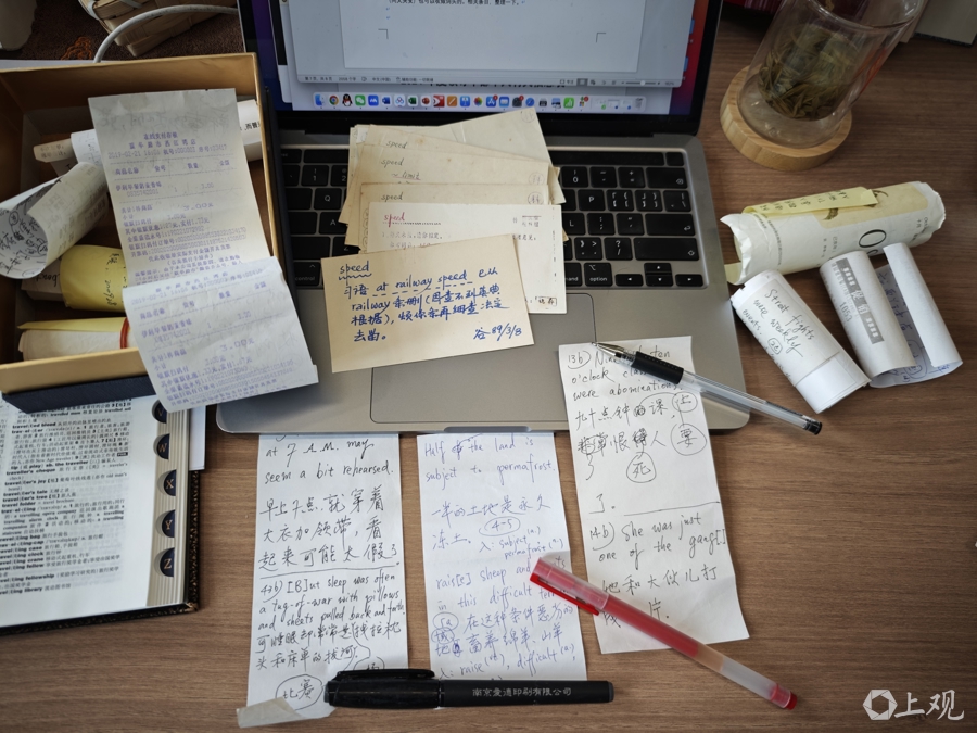 朱绩崧习惯在收银条背后随手记录想法,从老师的手写卡片到一卷卷收银条,是时光记录下的“编舟记”。杨铭宇摄