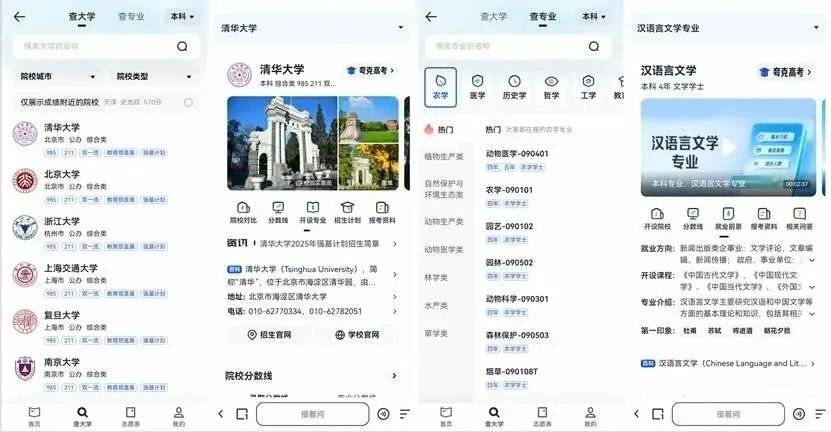 家长可以通过夸克【查大学】、【查专业】功能,获取全面详实的数据,搜索全国院校与专业信息,全面了解多校区情况;各个大学的分数线、开设专业、招生计划、就业去向等信息,各个专业的开设院校、分数线、发展前景、就业去向等信息,家长都需要细致查看。