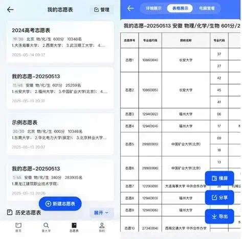 同时,家长把意向的志愿一键添加【我的志愿表】,随时在线编辑、查看,以及多格式导出、分享、手机电脑实时同步,实现多方案对比、检查不错漏;出分前预填志愿表,出分后根据实际分数、最新招生计划,家长可以一键更新,实现高效管理。