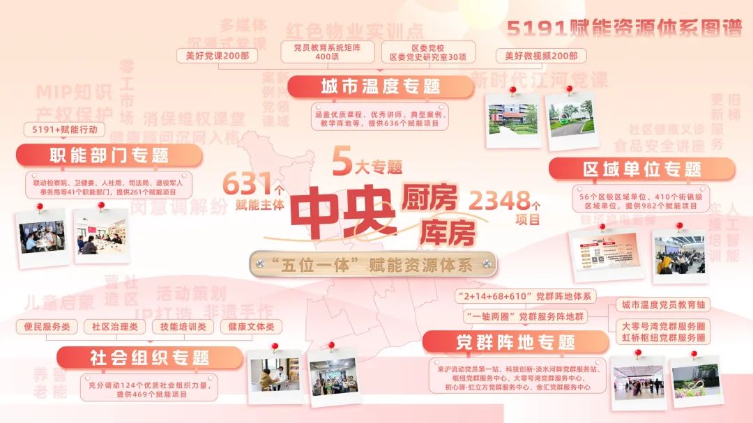 政治赋能是核心。依托200部美好党课、400多个党员教育矩阵资源,全面提升各领域党员教育质效。充分发挥职能部门赋能基层主力军的作用, 实施“5191+”赋能行动,检察、红色物业、退役军人、就业等一系列项目先后落地。整合区域单位和社会组织力量,丰富赋能资源供给,113个区级区域单位和400多个街镇区域单位提供了近千个赋能项目。强化党群服务阵地赋能枢纽功能,着力打造“一轴两圈”党群服务阵地群,发布了首批6个现场教学点位,持续夯实资源赋能实体支撑。