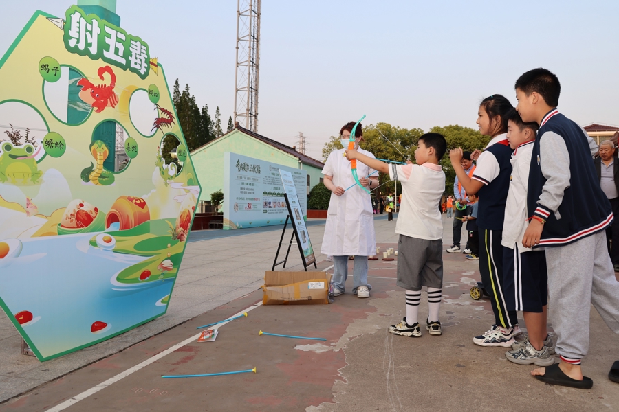 而在广场另一边的亲子体验区,则挤满了各个年龄段的小朋友们。他们有的学做艾草小灯笼,有的学扎非遗朱泾花灯,有的跟着老手艺人学捏面人,还有小朋友拿起弓箭体验射五毒游戏。生动有趣的体验活动,让孩子们在实践中感受传统民俗和非遗文化的魅力。
