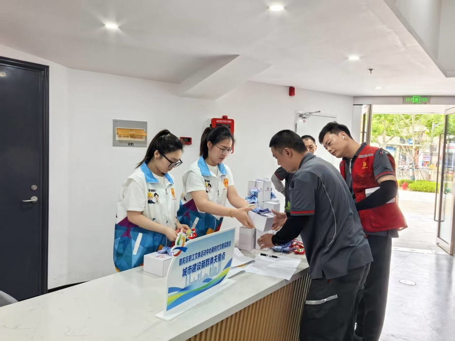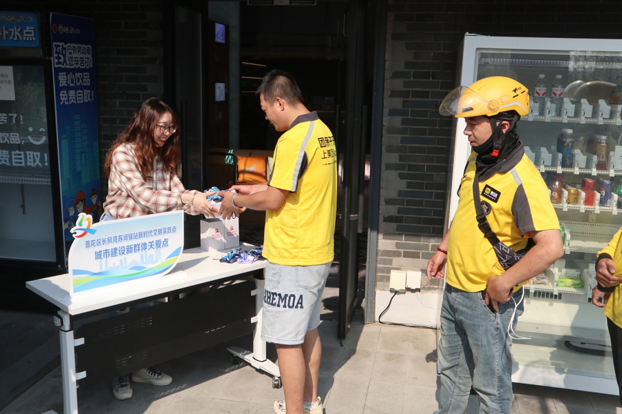 端午佳节来临之际,普陀区新时代文明实践中心在长风湾苏河驿站、近铁e站、新金环、普陀区职工文体活动中心四个“城市建设新群体关爱点”为快递员、外卖骑手等户外工作者送上节日慰问和祝福。