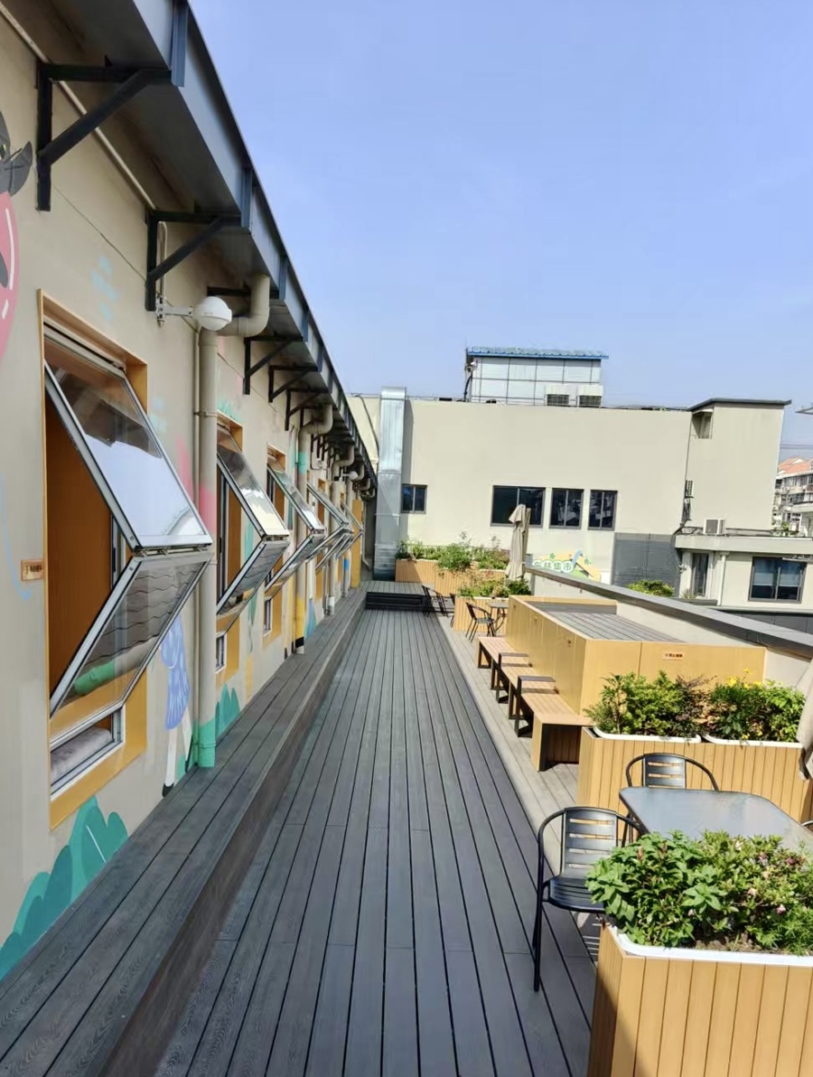 比如,在不改变场地原有结构的基础上,上大美院设计团队打造了一个室外露台空间。设计项目经理徐鸿波介绍,露台空间原本是过道,考虑到平时许多老人会带孩子过来休息,周末亲子家庭活动也比较多,因此增设卡座椅、绿植花箱、遮阳伞,搭配活泼的墙面插画,使其成为全年龄段友好的户外休闲区域。
