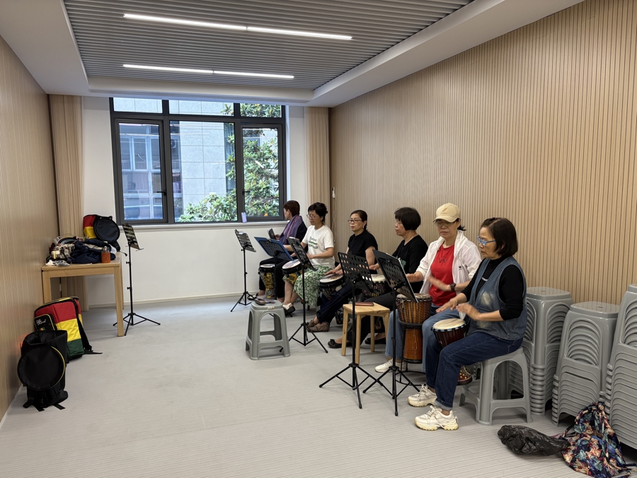 采访当天下着雨,几间文体活动室却是“客满”状态。面积最大的舞蹈室内,十几位舞蹈达人正在排练扇子舞;一旁的两间隔音小教室,一间合唱队在用,另一间非洲鼓队在用。