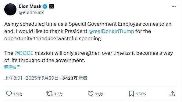 马斯克表示,在他作为特别政府雇员的任期即将结束之际,他想感谢美国总统特朗普给予的减少政府浪费性支出的机会。