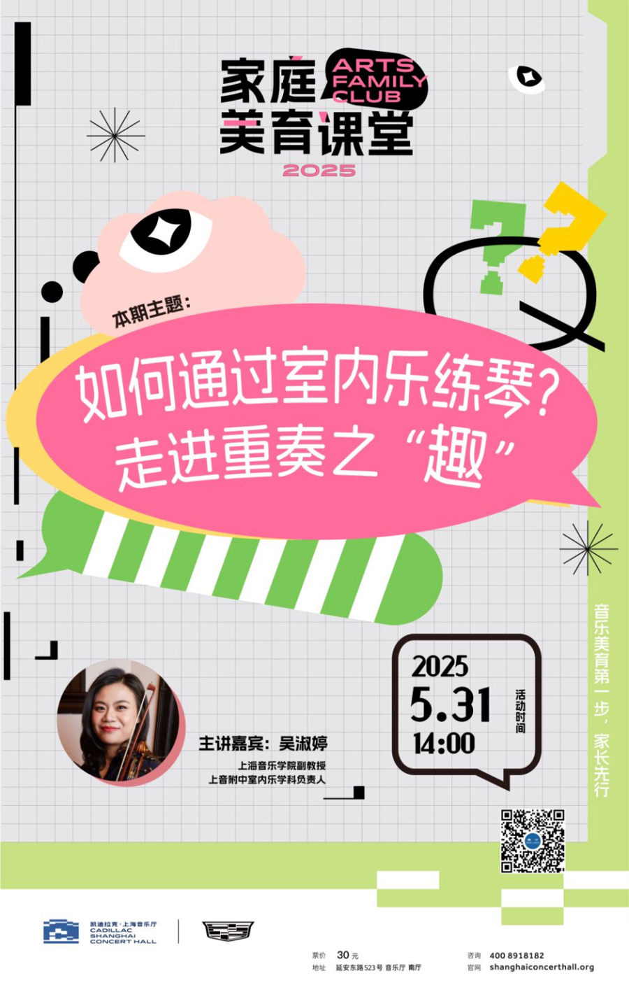 5月31日,上海音乐厅“家庭美育课堂”特邀上海音乐学院副教授、上音附中室内乐学科负责人吴淑婷,引导亲子家庭走进室内乐世界,并体验“家庭重奏”的新颖练习方式。“家庭美育课堂”是凯迪拉克·上海音乐厅推出的艺术教育品牌活动,旨在为在音乐学习路上面临挑战的家庭提供最前沿的美育观点,让音乐教育成为连接个体、家庭与社会的桥梁,使音乐的活力与灵感融入家庭的美育生活中。