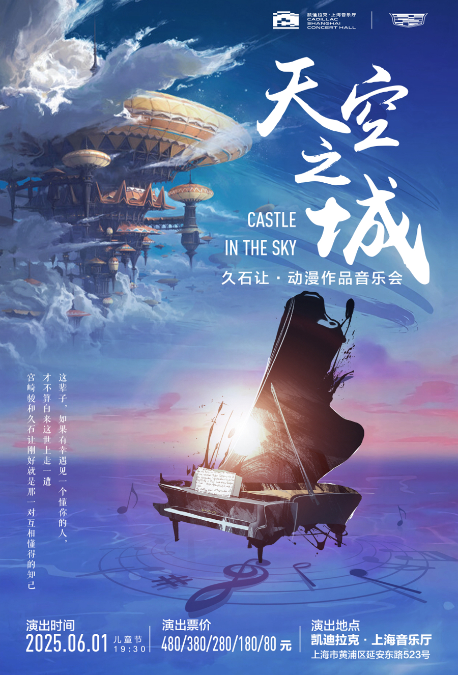 6月1日儿童节当晚,上海音乐厅将化身二次元声场,Kalliope卡里欧室内乐团温暖献演《天空之城》久石让动漫作品音乐会。在这场专为儿童节打造的视听嘉年华中,《天空之城》《魔女宅急便》等经典IP旋律将带领观众重温久石让电影音乐的感动。