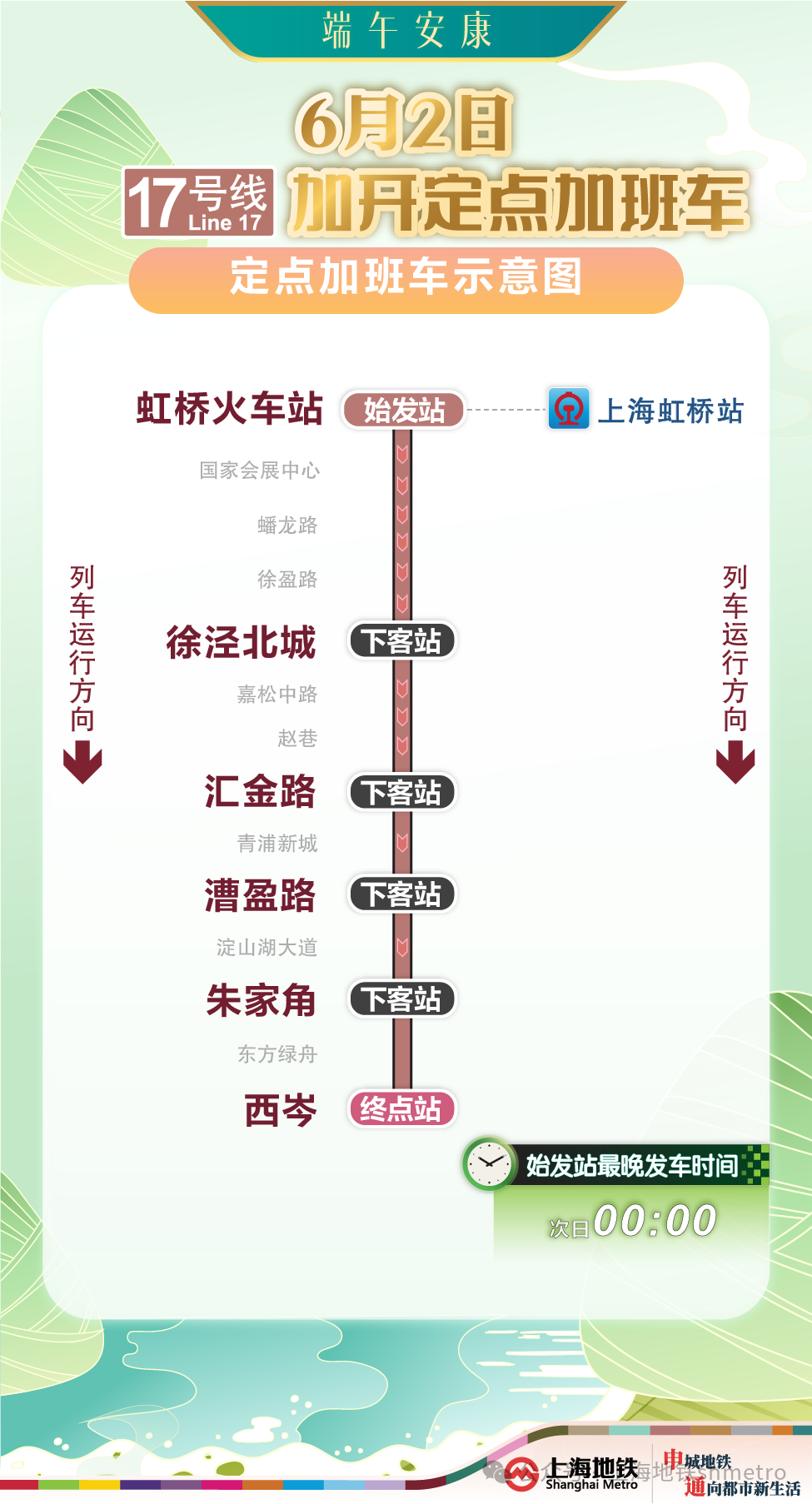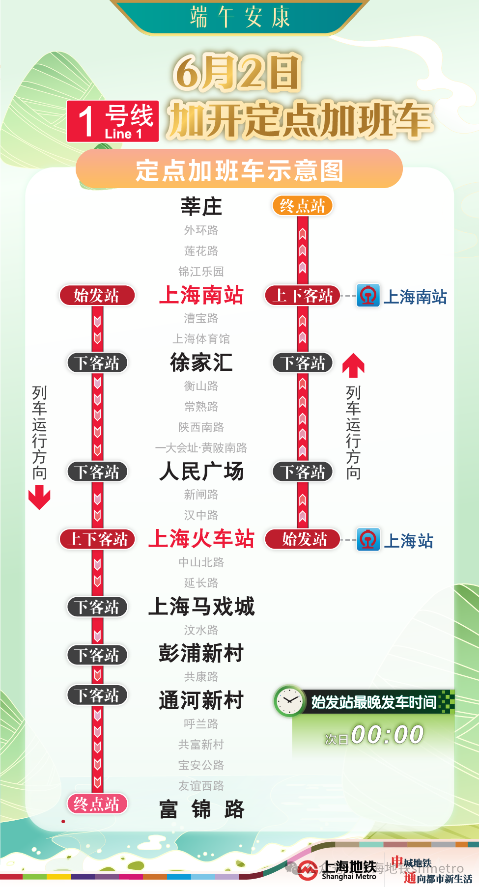 为缓解中心城区夜高峰休闲、购物客流密集的压力,做好虹桥火车站夜间列车集中到达大客流疏散工作,6月2日假期最后一天,1、2、10、17号线将实施定点加开方案,均加开末班车延长至次日0点: