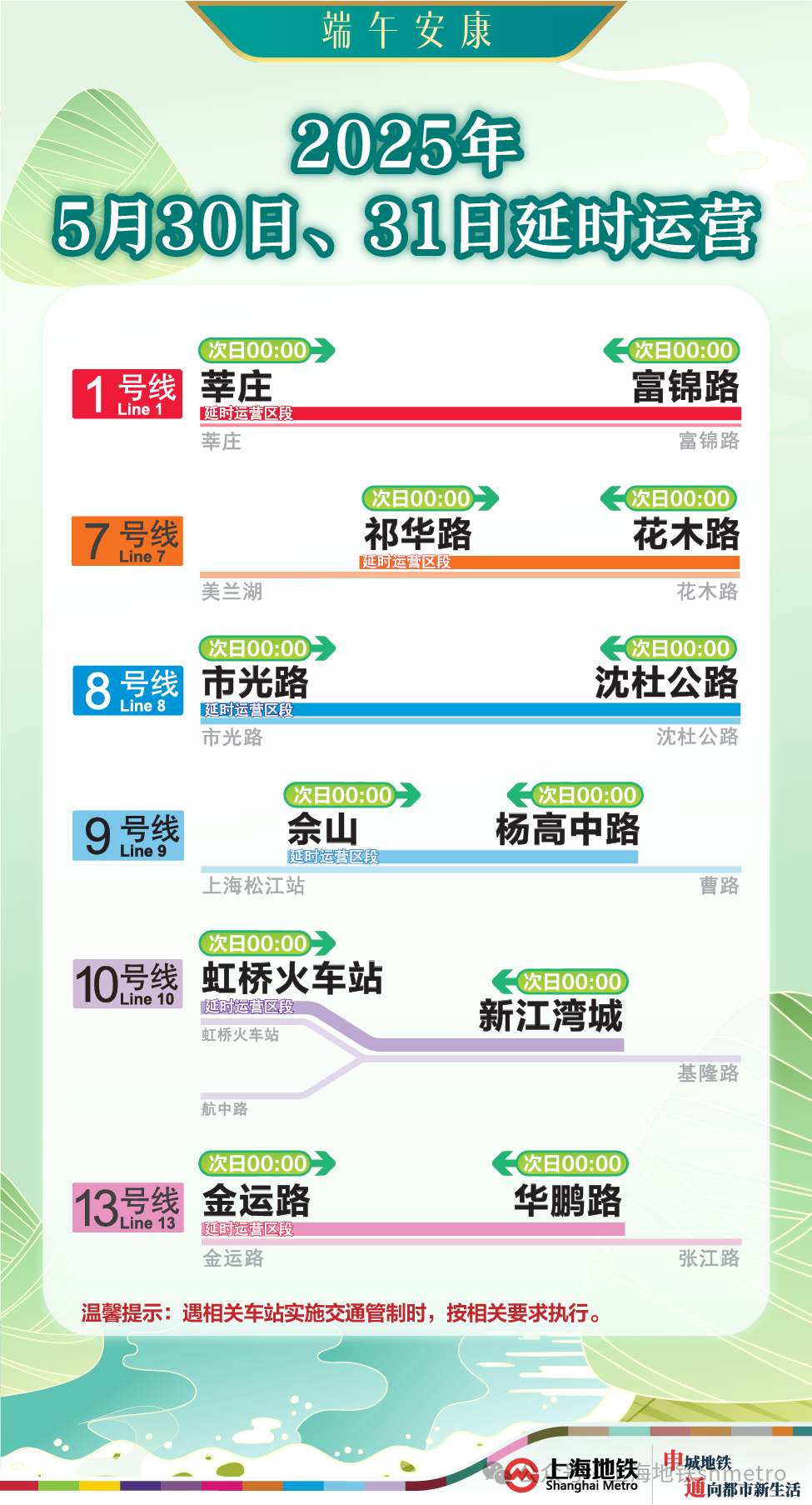 5月30日、31日,上海地铁1、7、8、9、10、13号线六条线路将实施常态化周五周六延时运营。