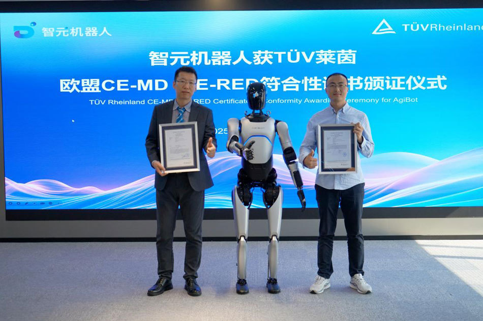 CE认证全称是“Conformité Européenne(欧洲合格认证)”,是欧盟市场对产品安全性的强制性准入要求。其中,欧盟无线电设备和电信终端设备指令(CE-RED)针对无线通信产品,主要检测射频性能、电磁兼容性及辐射安全,确保设备在欧盟市场使用时不会干扰其他电子设备且符合健康规范。欧盟机械安全指令(CE-MD)重点评估产品机械结构安全性、风险防护措施等,确保设备运行的整体安全。国际独立第三方检测、检验和认证机构德国莱茵TÜV对智元远征A2进行了机械安规、电气安规、功能安全的严苛测试,证明远征A2从整机功能、系统设计、软硬件开发等维度全面满足国际安全规范。智元远征A2是中国首个获得CE-MD认证的人形机器人,标志着远征A2在安全设计、风险控制和技术成熟度上达到了国际权威标准,为人形机器人规模化应用奠定了安全基石。