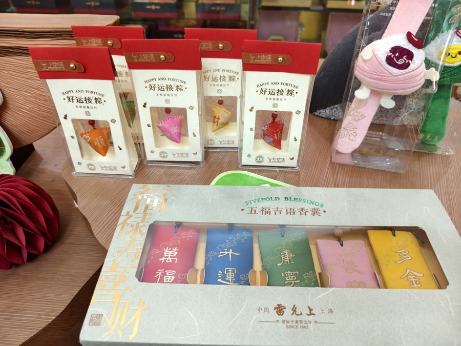 佩香囊彩带,挂艾草菖蒲。临近端午节,富有仪式感的民俗传统人气高涨。上海市场上,五颜六色的香囊令人眼花缭乱。在静安寺附近的雷允上西区药店门口,小小的花车上挂满了各色香囊,采购者络绎不绝。
