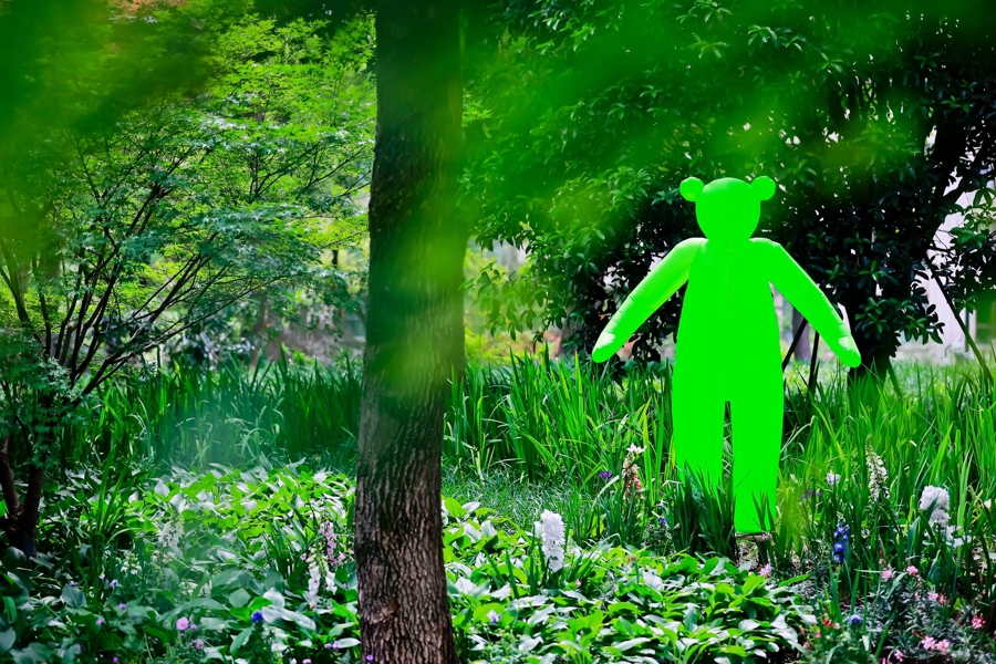 除了露露这样的个人参与策划,上海当代艺术馆也在今年的花展中意外“露脸”。艺术馆特邀来自法国的艺术家设计了高达9米的巨型充气熊,让它在花海中震撼亮相。这只“伊贝尔熊”与当代艺术馆里正在举办的展览遥相呼应、双向引流——有人去了画展再去花展,也有人在花展里看到它后走进了艺术馆。
