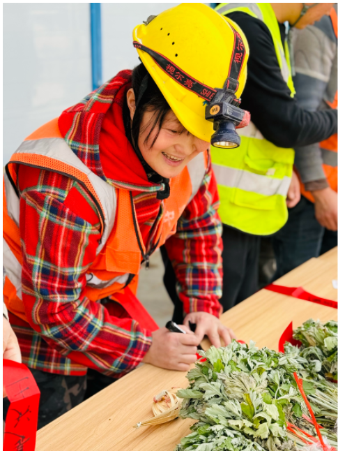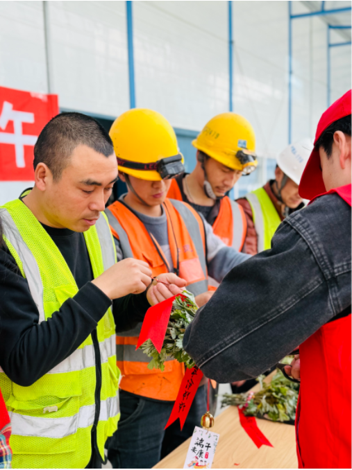 活动现场,洋溢着浓厚的节日氛围与温馨气息。志愿者们与工友们携手合作,将竹条与艾草精心编织成一个个寓意吉祥的艾草门挂。大家亲手书写 “高高兴兴上班,平平安安回家”“安全重于泰山” 等安全标语丝带,系在门挂之上。这些承载着安全祝福的艾草门挂,不仅是端午佳节的美好象征,更成为时刻提醒工友们重视安全的醒目标识,让安全意识以传统文化为载体,入眼、入脑、入心。