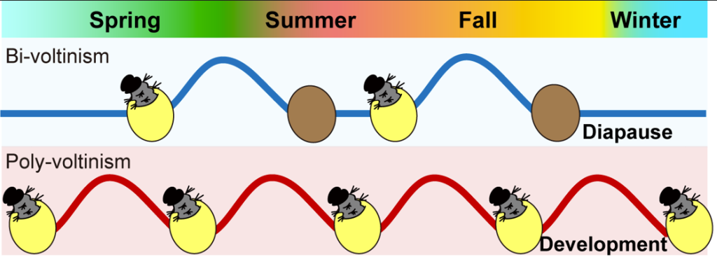 昆虫的滞育类似于动物的冬眠,即在特定时期或特定季节性信号(包括光周期、温度等)的诱导下发生的发育停滞行为,同时伴随生理、代谢、表型等方面的变化。滞育的发生帮助昆虫应对不利环境并显著延长昆虫的世代周期,因此也是造成昆虫不同年度生活史的生理基础(例如:很多害虫的北方种群由于滞育一年发生1-2代,而南方种群一年可发生多代)。昆虫种类众多,滞育形式各异,但目前只有模式昆虫—果蝇的滞育变异机制得到了部分解析。