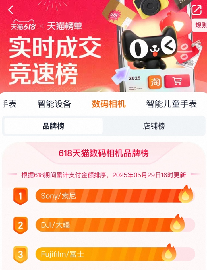 今年618,数码相机迎来消费热潮,品牌迎来销量大爆发。5月30日,记者获悉,截至5月26日,天猫618第一阶段,数码相机品类累计成交较去年618同期增长超80%,富士、索尼、佳能、大疆等品牌增长迅猛。其中富士成交同比增长170%,大疆同比暴涨540%,大疆Pocket 3、索尼A7C II、尼康Z30、大疆OA5 pro、影石Insta360 GO 3S等多个爆款单品成交破千万。