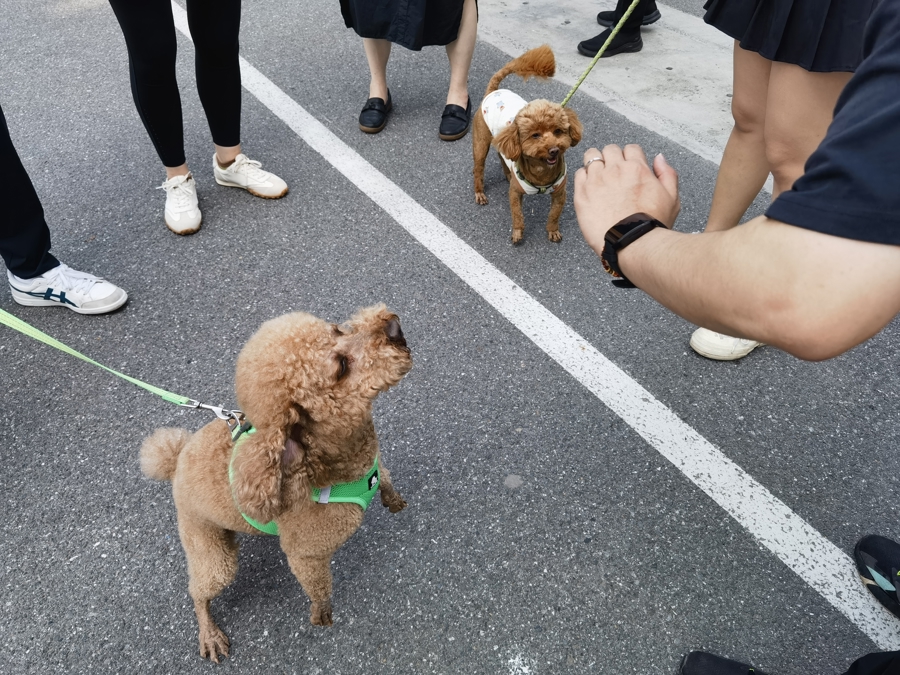 小蒋是田园第二外语实验小学一年级学生。今天,她带着妈妈陶女士和家里2岁大的灰泰迪一起去上学,一会儿参加集体捡垃圾活动,一会儿又去挑战宠物技能赛,和同学们玩得不亦乐乎。