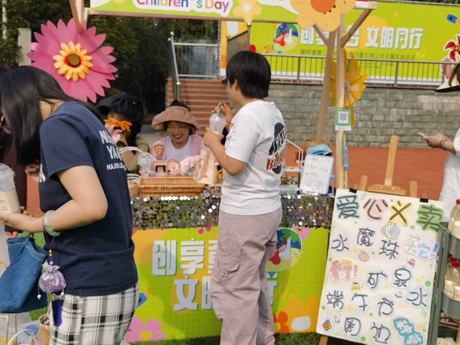 同时,面部彩绘、扭扭棒花艺、漆扇体验等来自全镇各学区的手工摊位也吸引了大家的参与。义卖区分为学前段和中小学段两大板块,孩子们自制的手工艺品琳琅满目,包括漆扇、中国结、树叶书签、瓷珠手环等,每一件都凝聚着童真与巧思。现场还特别设立云南保山“双城咖啡”摊位,大家可以一边品尝醇香的咖啡,一边为公益助力。