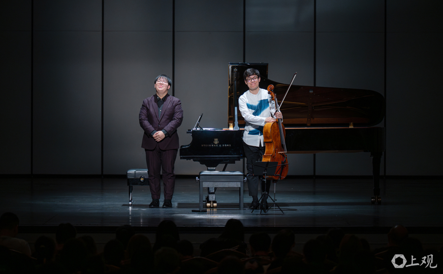 执弓者是史上最年轻柴可夫斯基国际音乐比赛大提琴冠军冯勇智(Zlatomir Fung)。与他并肩的是2024年克利夫兰国际钢琴比赛五项大奖得主、中国培养的钢琴家韦子健。