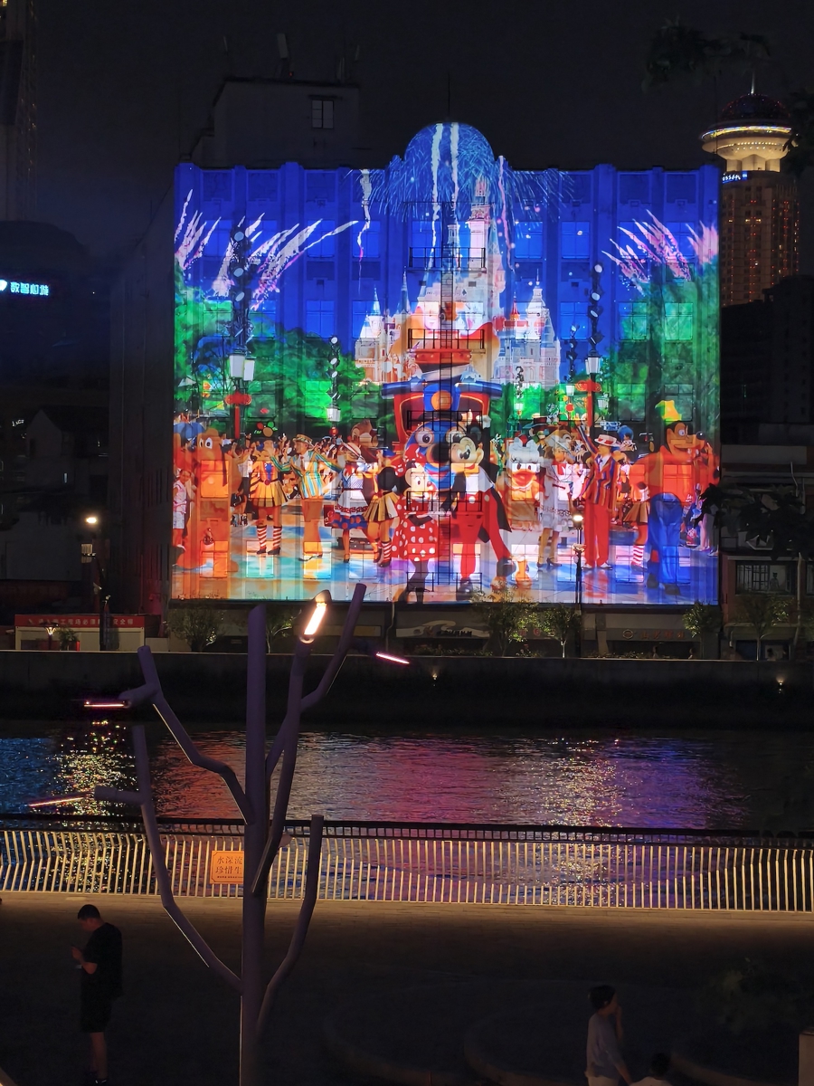 5月31日傍晚,夜色渐浓,苏州河畔散步的人们蓦然邂逅建筑外墙上的“光影美术馆”,于光影交错中与《“中华第一街”上海南京路》《上海迪士尼》《上海长高了》《午茶》等若干美术佳作来了一场“空间巨幕级”邂逅。