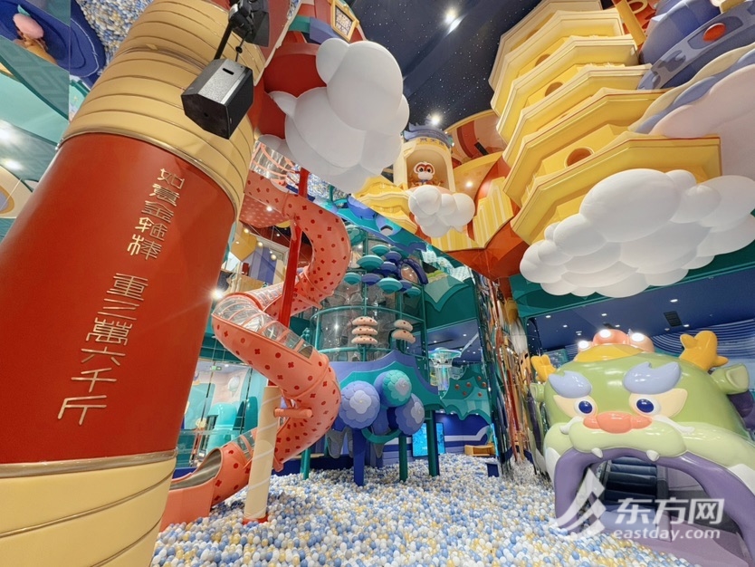 乐园联通了环球港2楼至3楼的两层空间,设有40余个玩乐项目,其中最“壮观”的要数全景复刻的《大闹天宫》场景。从2楼的“东海龙宫”逐步延伸向上到“筋斗云”步道和“云霄宝殿”攀爬架,可以让小朋友攀爬体验“腾云驾雾”的乐趣,循迹至3楼时,“弼马温”“炼丹炉”“蟠桃宴”“瑶池”等场景悉数登场。