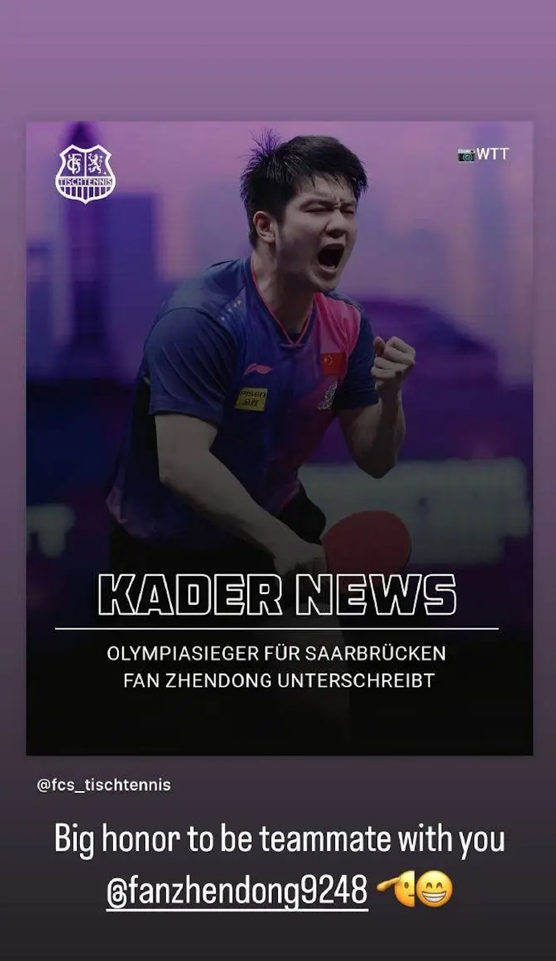 在俱乐部官方声明中,樊振东表示:我真的很期待在萨尔布吕肯和德甲的新挑战,体验新的环境——并与球队一起赢得更多的胜利。