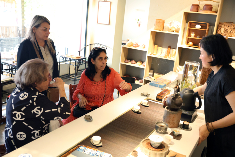 远在地球另一端的客人们受邀静坐片刻感受中国江南茶艺文化。