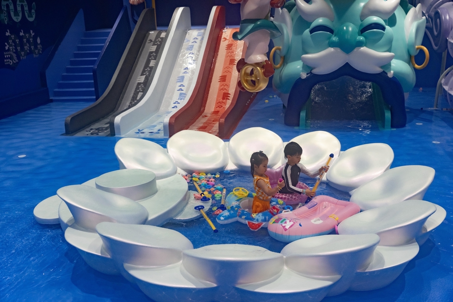 小朋友在乐园内的哪吒主题区域里嬉水玩耍。