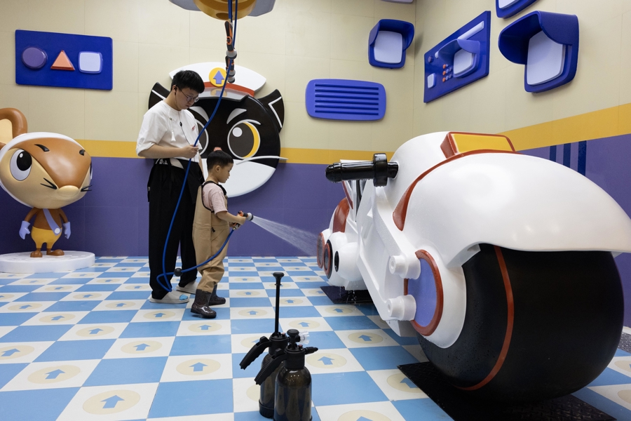 小朋友在工作人员的协助下在黑猫警长主题区体验清洗摩托车。