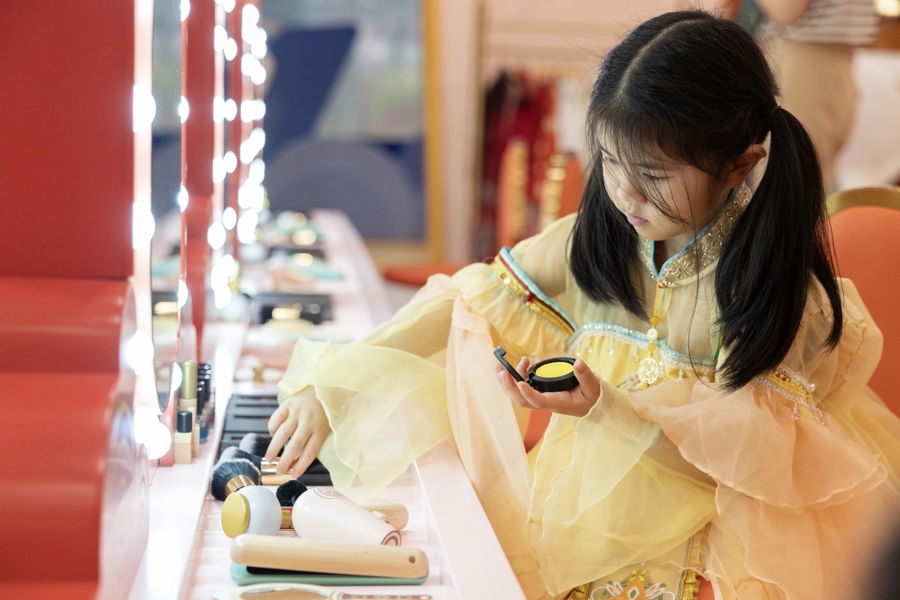 一名小朋友在乐园内体验化妆。