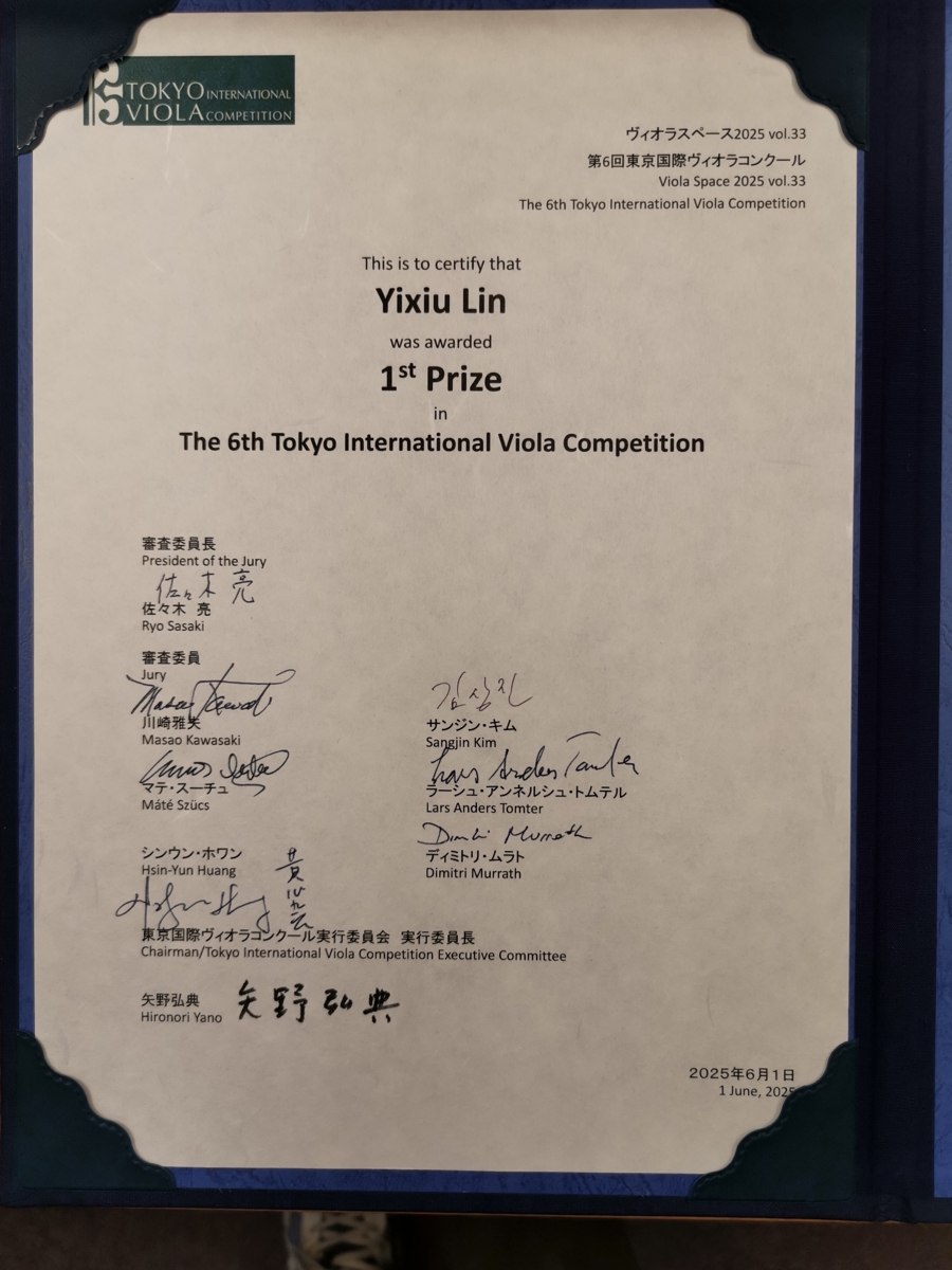林怡秀获得第六届东京国际中提琴比赛冠军