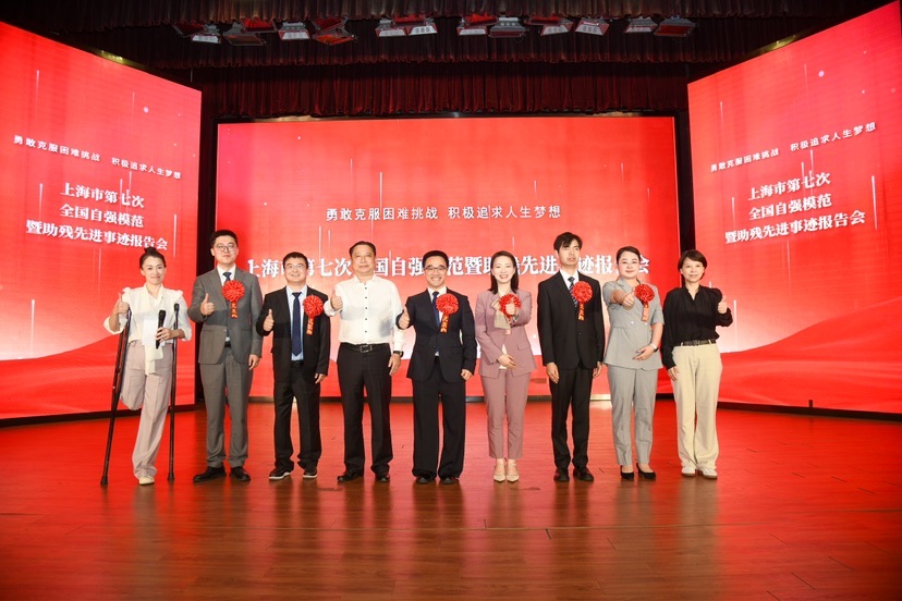 会上,全国自强模范代表陆学峰、吴斐、叶浩、蒋政强依次上台,分享各自的奋斗历程。陆学峰作为先天性肢体残疾人,从体育赛场到创业之路,始终心怀感恩,创办 “荼小爱” 茶饮品牌助力残疾人就业;听力二级残疾的吴斐毕业后留校任职,在特殊教育一线深耕十载,助力 200 余名听障生实现高质量就业;叶浩虽肢体残疾,却在科创领域不断突破,创办公司并为残疾人就业搭建桥梁;蒋政强作为一级视力残疾人,在求学路上奋勇拼搏,积极投身志愿服务,展现了视障群体的自强风采。“命运或许会给我们设置重重障碍,但只要心中有梦,脚下有力,再高的山也能翻越,再宽的河也能跨越。让我们怀揣希望,砥砺前行,书写属于自己的辉煌篇章!”自强模范们自身的故事,深情地鼓舞着台下每个人。 随后,全国助残先进集体代表上海三享两益青年职业发展促进中心、圆通速递有限公司代表也分享了他们的助残经验。上海三享两益青年职业发展促进中心更是从成立以来就始终致力于为残障青年提供职业技能培训、就业对接及心理支持服务,累计帮助数百名残障人士实现高质量就业,用实际行动践行了“平等、融合、共享”的理念。圆通速递的 “圆梦行动” 公益助残项目,通过开发适合残疾人的岗位、提供个性化培训和科技支持,已帮助19300多名残疾人就业创业,打造了残健融合的良好氛围。 此次报告会不仅展现了残疾人自尊、自信、自强、自立的精神风貌,推广了优秀助残经验,更为广大师生和社会各界传递了积极向上的正能量,激励着更多人在各自的人生道路上奋勇前行,共同营造关爱残疾人、支持助残事业的良好社会氛围 。 据悉,市残联机关各处室、事业单位相关负责人,部分区残联相关负责人和残疾人代表、残疾人工作者及先进集体单位代表,相关助残志愿者、社会组织代表,上海应用技术大学学生等600余人参加本次报告会。