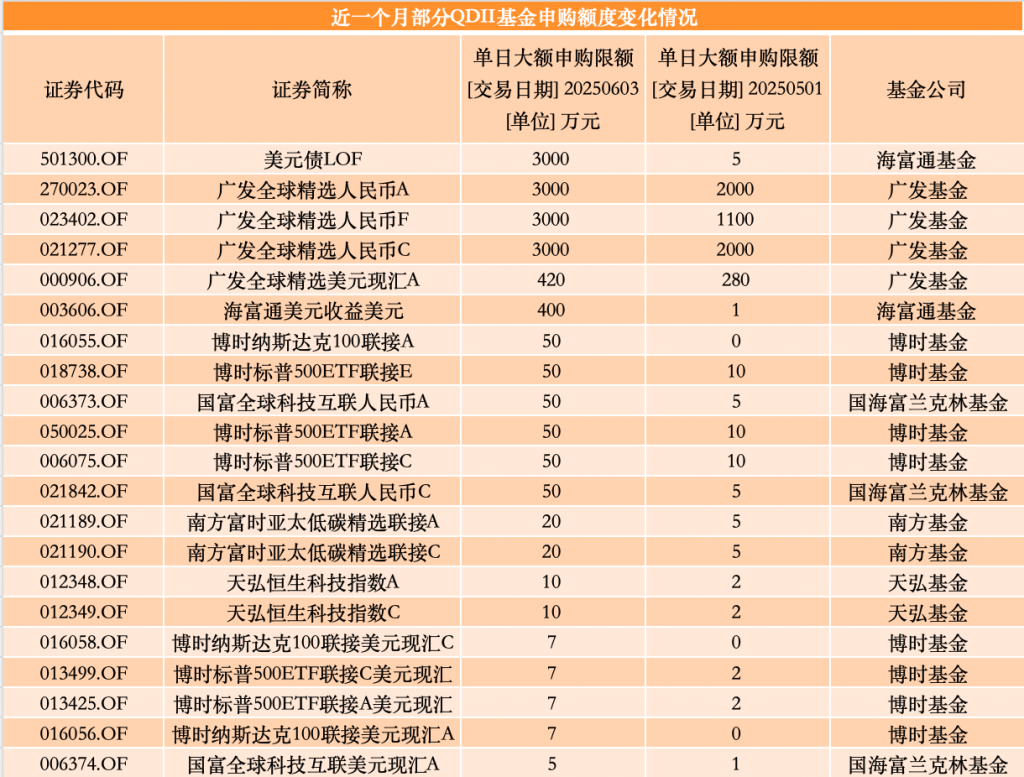 澎湃新闻记者据Wind数据统计,或因场内跨境ETF投资热度的降温,与5月初时相比,近期不少场外QDII类基金额度有所放宽,如海富通美元债、广发全球精选人民币、博时纳斯达克100ETF联接、国富全球科技互联人民币等。其中,5月30日,海富通美元债由3月份时的限购5万元调高至限购3000万元。