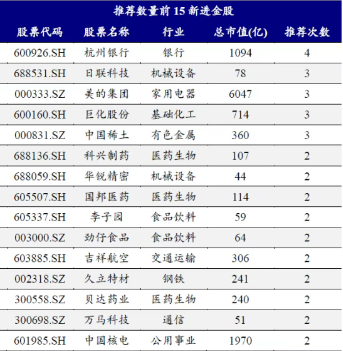 落实到各个热门行业方面,电子板块的最热金股为安集科技(688019)、芯原股份(688521)、沪电股份(002463)、立讯精密(002475)、工业富联(601138)等,合计均被推荐了2次。机械设备板块第一为日联科技(688531),合计被推荐了3次。医药生物板块最热的是长春高新(000661)、国邦医药(605507)、亿帆医药(002019)、贝达药业(300558)、一品红(300723)等,合计均被推荐了2次。