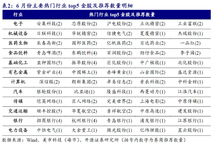 开源证券数据显示,相较5月份,6月券商金股增加最多的行业分别为非银金融、基础化工、传媒,增幅分别为1.7%、1.5%和1.4%。