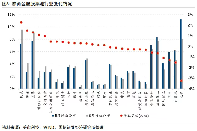 国信证券研报数据指出,从相对变化来看,券商6月金股在机械、传媒、医药等行业的增配较多。
