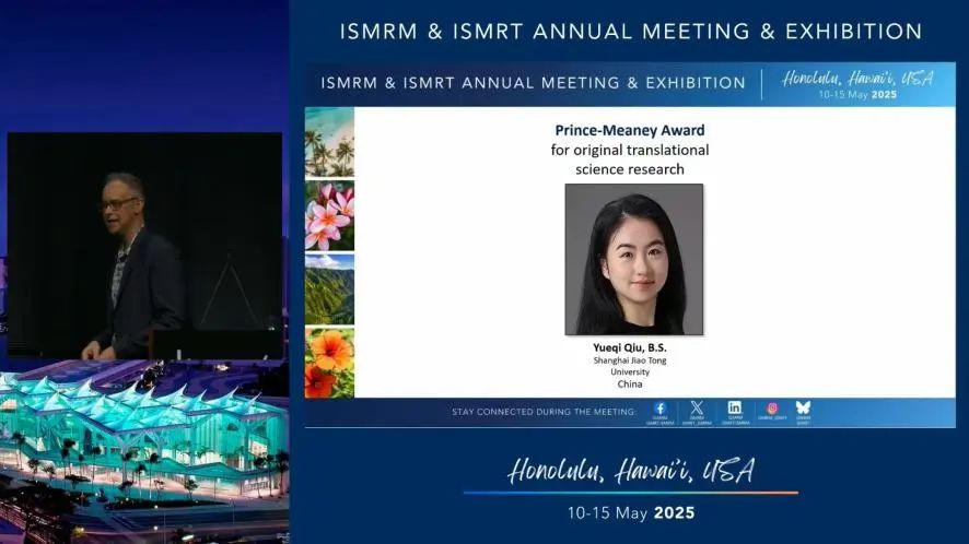Prince-Meaney Translational Science Award是ISMRM Young Investigator Award三大奖项之一,是ISMRM颁发的磁共振基础科学转化研究领域最高荣誉。评选采用论文评审、大会答辩及专家组终审三重遴选机制,每年仅授予全球范围内最具临床应用价值的突破性研究成果。