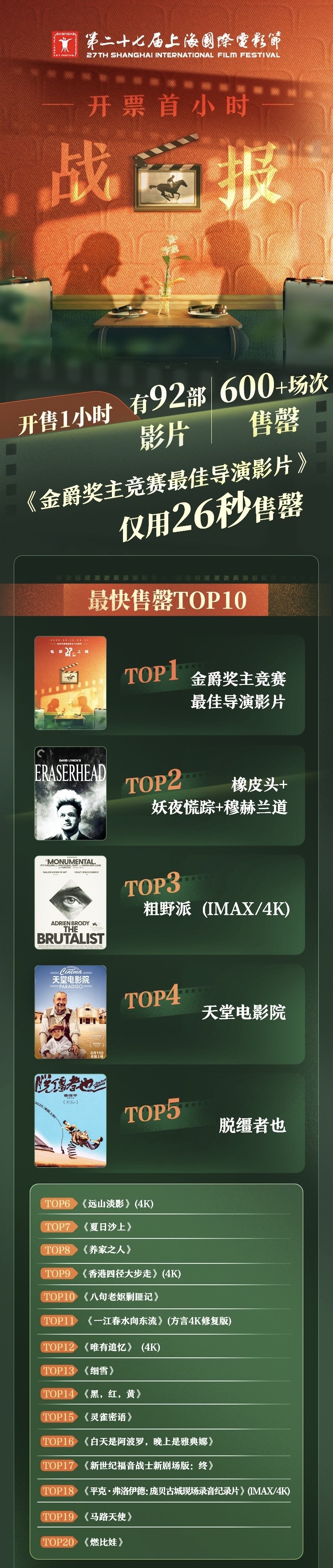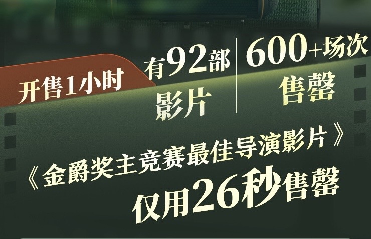 中午12时,淘票票和大麦购票系统,准时跳出“购票”链接,第27届上海国际电影节正式开票。开售一小时后,捷报传来,开票首小时售出影票37万张,有92部影片,超过600场次售罄,6月22日的《金爵奖主竞赛最佳导演影片》仅用26秒就告售罄,位列最快售罄第一位。