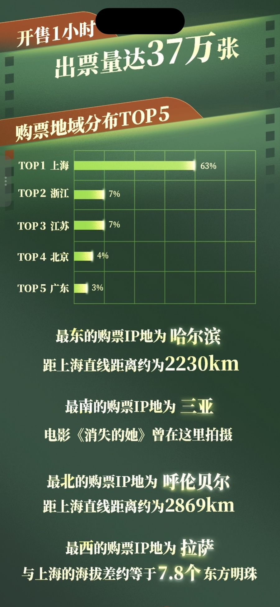 不仅上海影迷热情高,外地IP的购票也同样占到购票总数的37%,浙江、江苏、北京、广东紧随上海之后,位列购票地域分布的第二至第五位。其中,最东的购票IP地为哈尔滨,距离上海直线距离为2230公里,最南的购票IP地为三亚,最北的购票IP地为呼伦贝尔,距离上海近3000公里,而最西的购票IP地为拉萨。天南海北的影迷,将在这个六月,再次相聚于上海这座“电影之城”。
