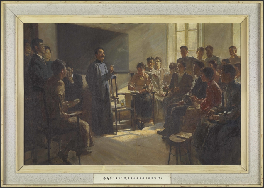 展览由“发轫于上海”“左翼潮涌”“时代强音”“深远影响”四个部分组成,共展出相关展品200余件(组),其中等级文物130余件(组),一、二级文物达70余件(组)。本次展览格外注重观众的参观体验,在展览动线规划和展陈手段设计上独具匠心,特别设计了一面以陈逸飞油画《鲁迅在左联成立大会上的讲话》为主体的立体造型墙,以此构建展览的主视觉焦点。《鲁迅在左联成立大会上讲话》是陈逸飞作于1972年的作品。这幅油画以1930年3月2日鲁迅在左联成立大会上讲话的场景为创作题材,表现了鲁迅作为中国左翼文化运动引领者的光辉形象。在“左联”成立大会上,鲁迅发表了《对于左翼作家联盟的意见》重要讲话,总结了中国革命文学发展的历程、经验和教训,提出了中国左翼作家联盟的基本方针和策略,并给予了告诫和要求。他的这篇讲话,是当时左翼文艺运动极具重要意义的文件。