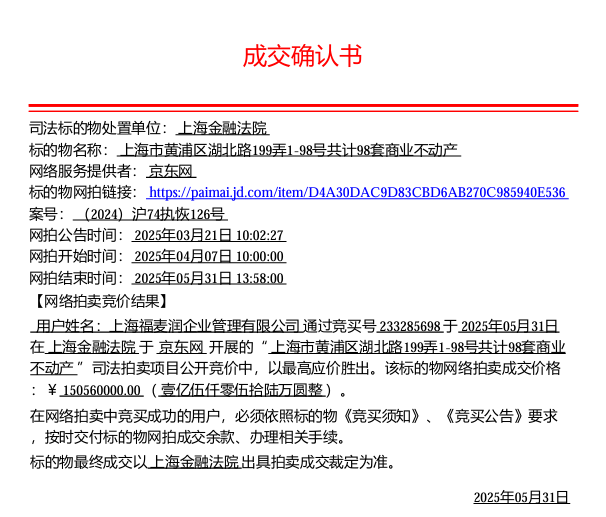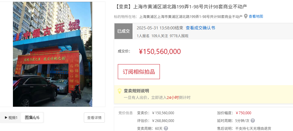 6月6日,据京东资产交易平台披露的信息显示,上海市黄浦区湖北路199弄1-98号共计98套商业不动产(中福古玩城)以约1.5亿元的价格成交,资产评估价约2.68亿元,竞得人为上海福麦润企业管理有限公司。