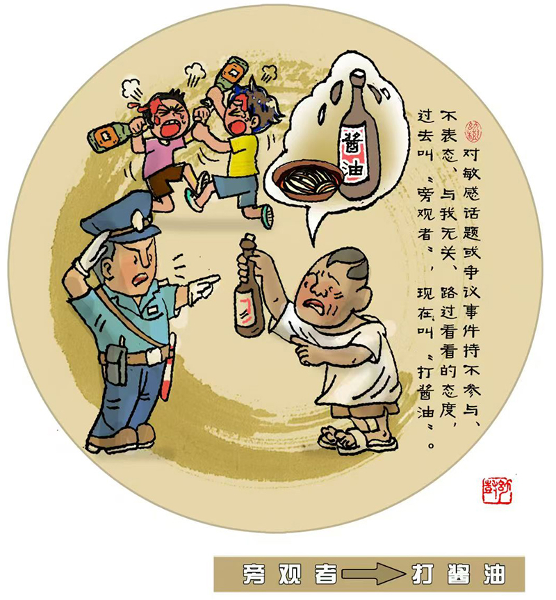 对敏感话题或争议事件持不参与、不表态、与我无关、路过看看的态度,过去叫“旁观者”,现在叫“打酱油”