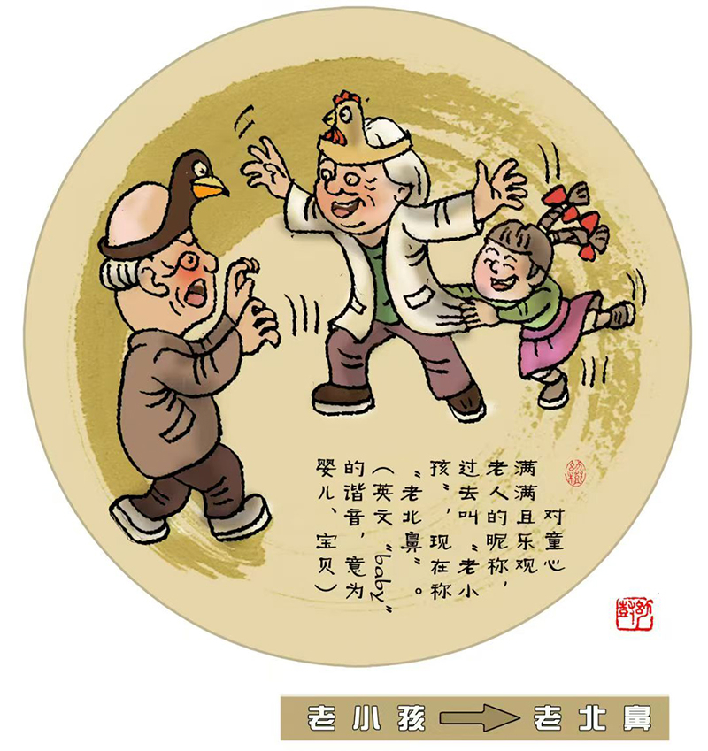 对童心满满且乐观老人的昵称,过去叫“老小孩”,现在称 “老北鼻” 。(“北鼻”英文“baby”的谐音,意为婴儿、宝贝)