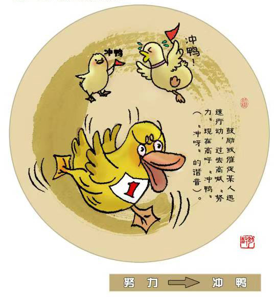 鼓励或催促某人迅速行动,过去高喊“努力”现在高呼“冲鸭”( “冲呀”的谐音),萌萌的,好玩