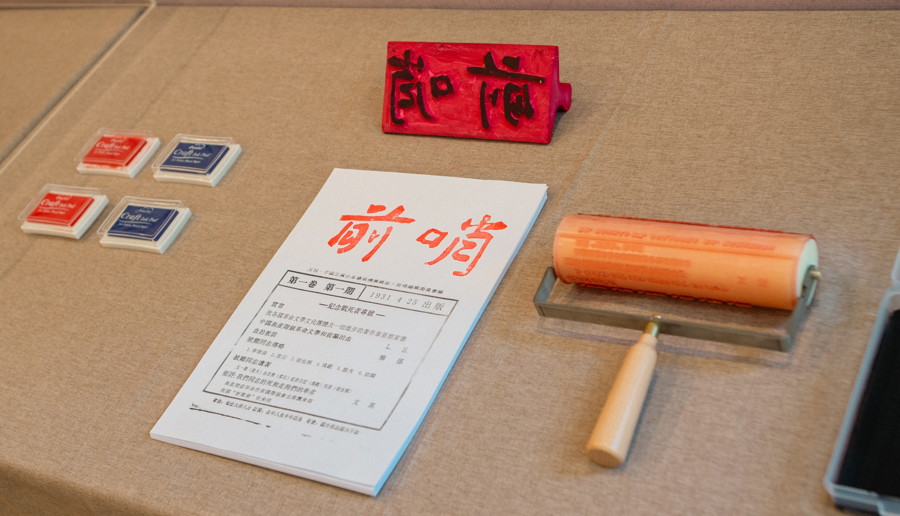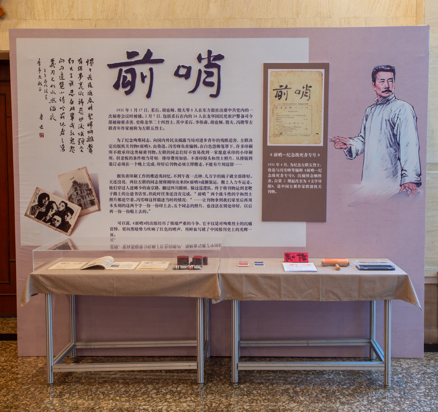 参观完全部展览内容,走出展厅,“前哨回响 永志不忘——‘《前哨》的出版’”互动区让人禁不住停下脚步。1931年2月7日深夜,包括柔石、殷夫、李伟森、胡也频、冯铿左联五烈士在内的24名青年革命者,戴着叮当作响的镣铐,高唱着《国际歌》,走向就义刑场。为揭露国民党反动派的残暴和卑劣,鲁迅与左联党团书记冯雪峰一同编辑《前哨·纪念战死者专号》,不仅编入烈士们的传略、遗著,还刊载《中国无产阶级革命文学和前驱的血》等文章及宣言。在白色恐怖笼罩下,印刷所不敢承印这类秘密刊物。左联的同志们好不容易找到一家愿意承印的小印刷所,但老板的条件相当苛刻:排印费用加倍,不准印报头和烈士照片,从排版到装订必须在一个晚上完成,印好后刊物必须立即搬走。据负责印刷工作的楼适夷回忆,不到午夜一点钟,几万字的稿子就全部排好。天还没亮,两位左联的同志便将刚印出来的《前哨》成捆装运,搬上人力车运走。他们穿过人迹稀少的南京路,翻过四川路桥,躲过巡逻队,终于将刊物运到老靶子路上的公道书店里。但此时任务还没有完成,“前哨”两个战斗性的字和烈士照片都还空着。冯雪峰如此描述当时情景:“让刊物拿到我们家里后再用木头刻的这两个字一份一份印上去。五个同志的照片,也设法在别处印好,以后再一份一份贴上去的。”端详展柜里历经斗争诞生的《前哨·纪念战死者专号》,一旁的桌上,半成品“封面”已经备好,邀请参观者体验亲手最后一步“印刷”过程……