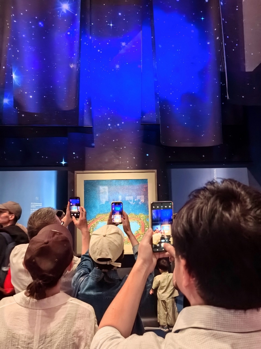 这不仅是一场延展,更是一场承诺,一次守望。展厅结尾处,那幅名为《今夜》的星空画作,如灯塔般照亮无数未眠人的心灵归途。观众穿行于黄永玉笔触下的自由天地,感受他画笔之下的深邃与热忱,见证一个艺术家如何以色彩为信仰,对抗岁月荒芜。题跋中那句“愿上天给人间每个人都有美好的今夜”在幽光中浮动。