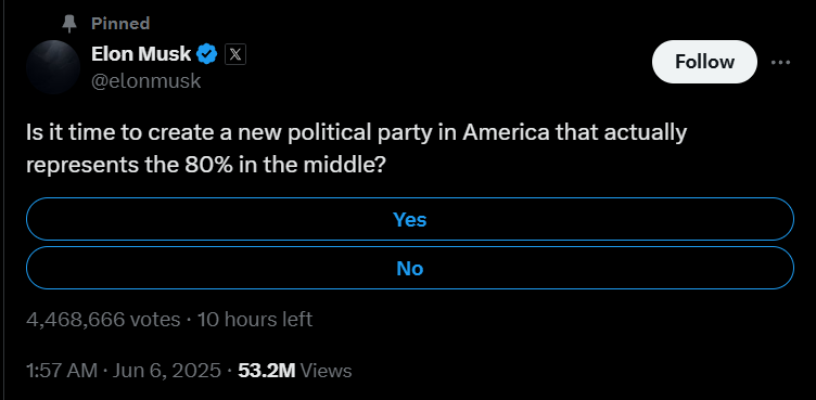 当地时间6月5日,马斯克在X上发起了调查,主题是“现在是时候在美国创建一个真正代表80%中间派的新政党了吗?”截至发稿前,十个小时的时间,该调查获得了超过446万张投票。