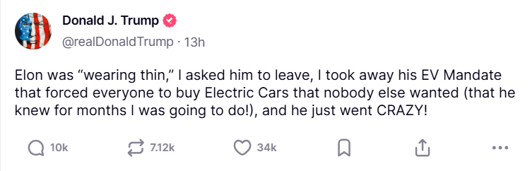 随后,特朗普在自己拥有的社交媒体“真相社交”上发起了更猛烈的攻击:“埃隆变得让人厌烦,我让他离开,我取消了他的电动汽车强制令……然后他就发疯了!” 他还威胁:“在我们的预算中节省数十亿美元的最简单方法,就是终止埃隆的政府补贴和合同。我一直很惊讶拜登没有这么做!”
