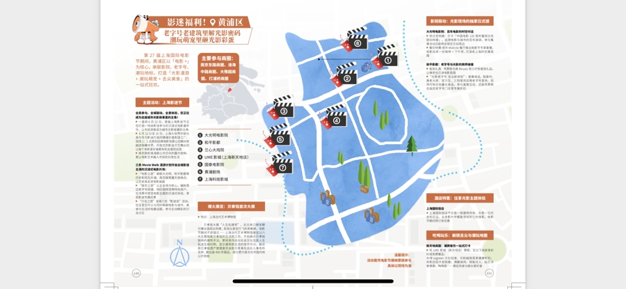 黄浦区那一页更是信息量满满,首届上海影迷节的三条主题路线、区内近期火爆的贝聿铭“人生如建筑”大展、大光明电影院的“中国电影120周年暨邬达克密码特展”的推荐之外,影迷还能知道,夜半餐厅、泰康食品、真老大房、邵万生、三阳南货店将有票根专属折扣,新天地商圈的众多潮牌餐饮业也参与票根折扣活动,甚至连上海国际饭店电影期间也有预定优惠……首次融入城市文旅元素的《电影生活手册》,相信会成为市民游客参与电影节、深入了解城市文化的重要“观影+消费”指南,还会成为上海国际电影节点亮消费新场景,提升消费新热度的最好见证。