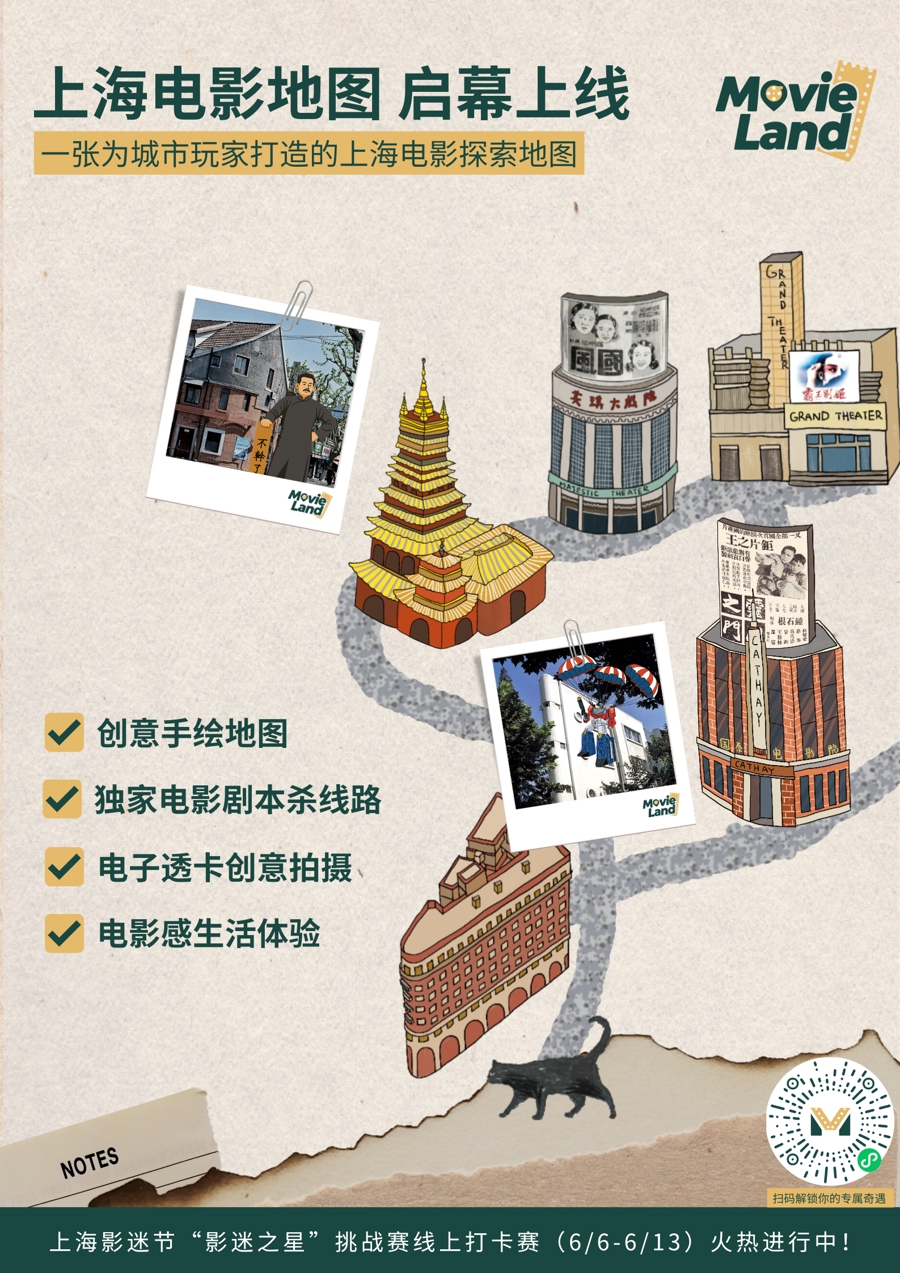 “Movie Land”亦即“上海电影地图”,更确切地说这是一张为城市玩家打造的上海电影探索地图。小程序系统整合上海跨越120年光影历程的电影史迹,汇聚数十个电影关键点位,涵盖经典影视取景地、历史影院旧址、著名影人故居等,并特邀插画师Rosa创作上世纪30年代至90年代风格的复古插画。进入小程序,八大主题探索线路赫然呈现,包括:“影史夕拾:武康路的电影修复之旅”“陆上行舟:沿苏州河探秘影像上海”“星球危机:陆家嘴拯救行动”等,涵盖丰富的路线、主题及“剧情”。用户可选择扮演特定角色如胶片修复师、记者等,在精心规划的约3公里行进路线中,探访每条线路精选的6处以上电影地标,完成剧情任务,深度融入城市电影叙事,化身“魔都故事的主演”。